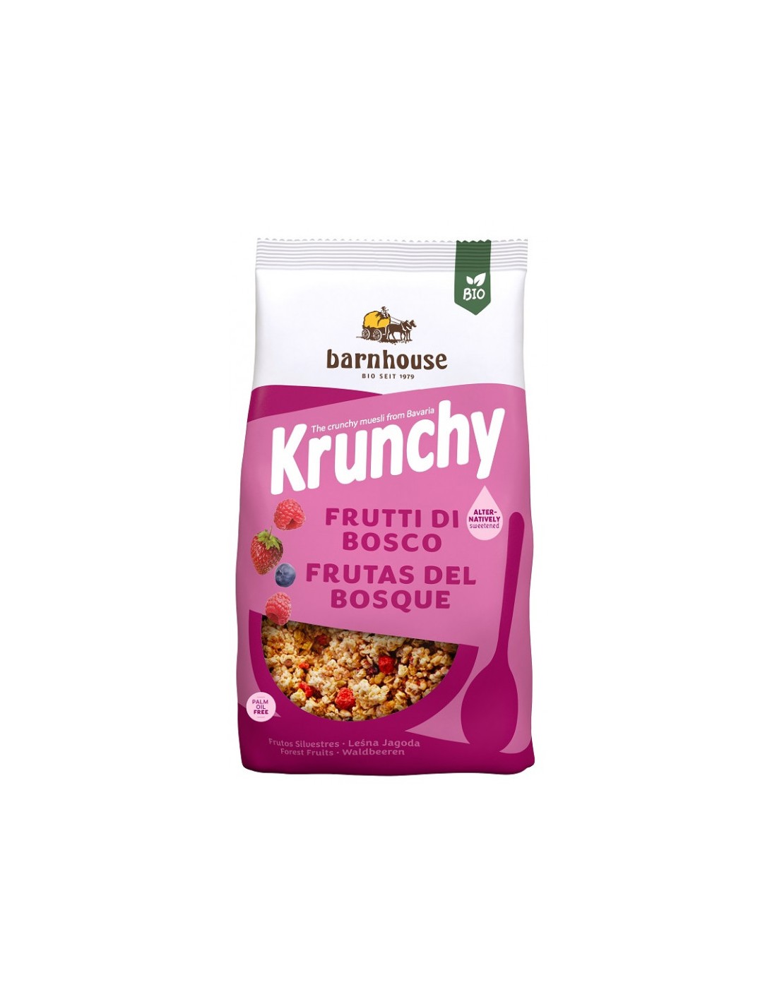 Muesli Krunchy combina el refinado sabor de la avena, la delicada dulzura del almíbar de arroz y la ligereza del arroz crujiente con una exquisita mezcla de frutos del bosque.